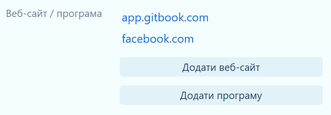 Веб-сайт / програма - Адреси веб-сайтів, де цей обліковий запис може бути використано та назви програм. Натисніть кнопку Додати веб-сайт, щоб додати адресу веб-сайту та Додати програму, щоб обрати назву програми.