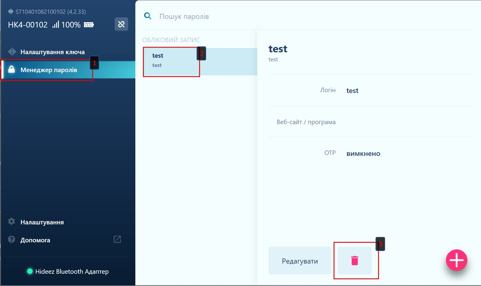 Щоб видалити обліковий запис, перейдіть до вкладки Менеджер паролів та натисніть двічі строку з обліковим записом, щоб відкрити деталізовану інформацію. Натисніть іконку Смітника.