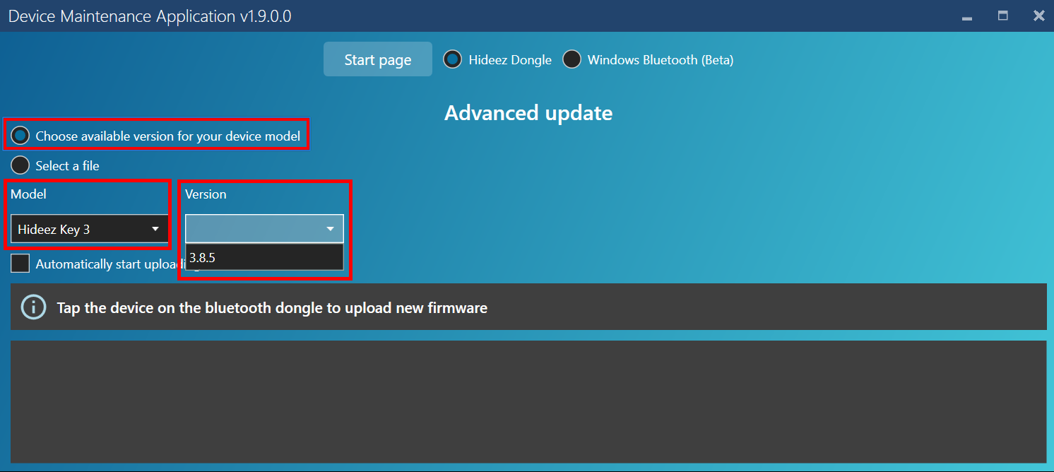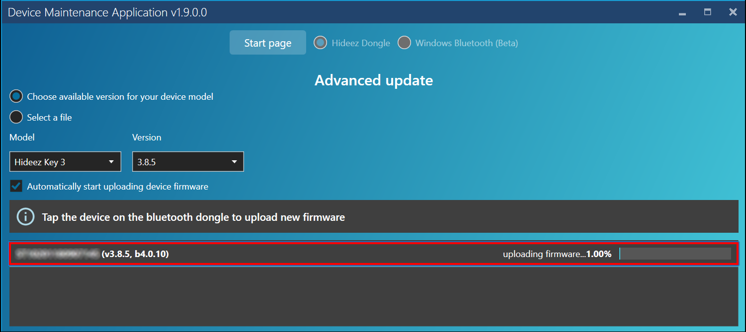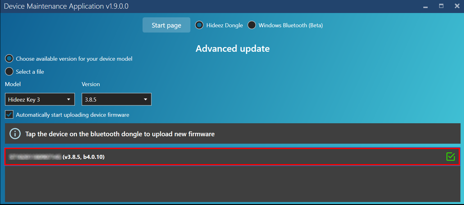 Будь ласка, зверніть увагу: якщо з якихось причин ви розірвали Bluetooth-з'єднання з вашим ключем під час встановлення прошивки, вам необхідно знову підключитися та продовжити встановлення прошивки через Advanced mode. Для цього оберіть модель ключа та відповідну прошивку.