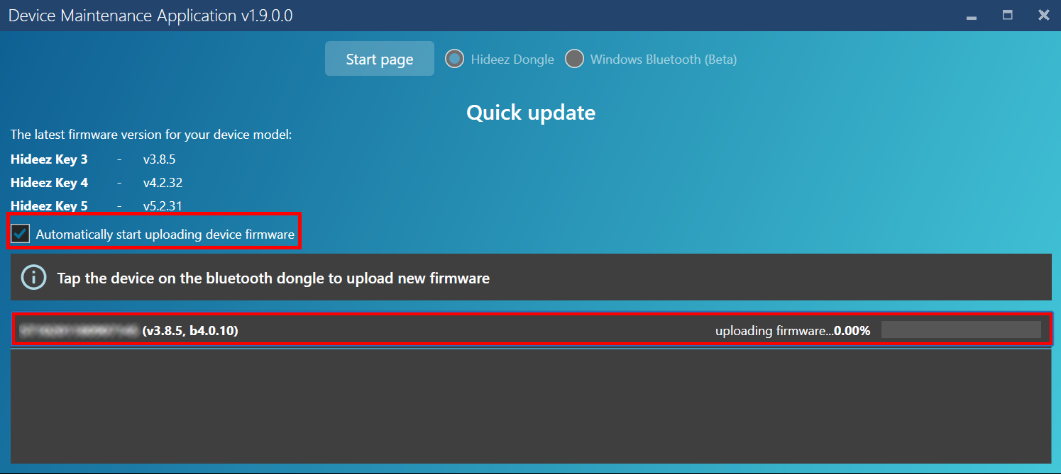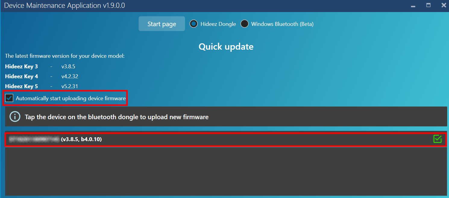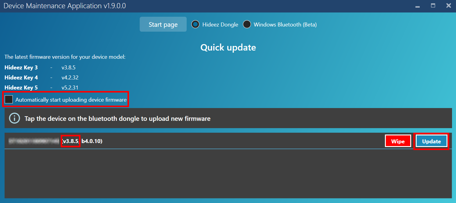 Опція "Automatically start uploading device firmware" вимкнена за замовчуванням. Активуйте її, якщо Ви впевнені, що хочете оновити прошивку. Якщо Ви не впевнені, Ви можете не активувати його, а перевірити вашу поточну версію прошивки і тоді натиснути за потреби кнопку Update.