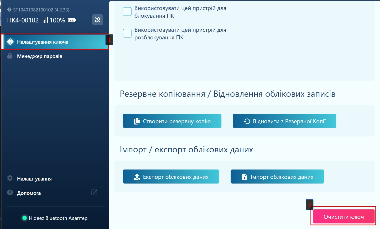Для очищення пристрою, перейдіть до вкладки Налаштування ключа та натисніть кнопку Очистити ключ внизу сторінки.