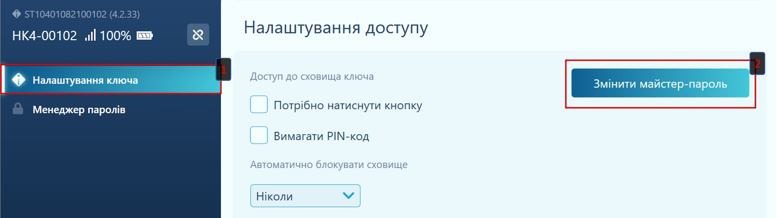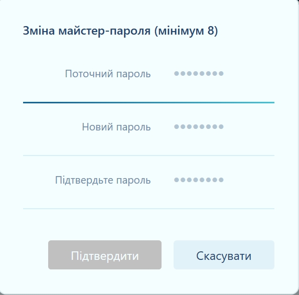 Для зміни майстер-паролю натисніть кнопку Змінити майстер пароль на вкладці Налаштування ключа. Введіть поточний майстер-пароль, потім новий (двічі) та натисніть кнопку Підтвердити.