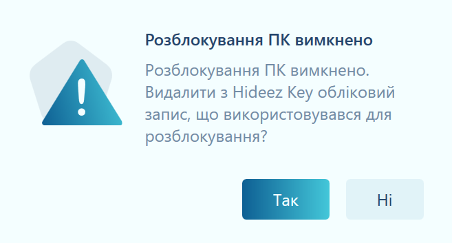 Обліковий запис для розблокування ПК може бути збережений на ключі навіть якщо Ви відключите опцію розблокування ПК з Hideez Key. Просто оберіть 'Ні' у вікні, що виникає після відключення опції 'Використовувати цей пристрій для розблокування ПК' та збереження змін.