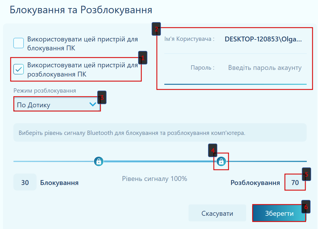Розблокування ПК лише за механізмом проксіміті. Щойно рівень сигналу Bluetooth перевищить задане значення у %, ваш ПК буде розблоковано.