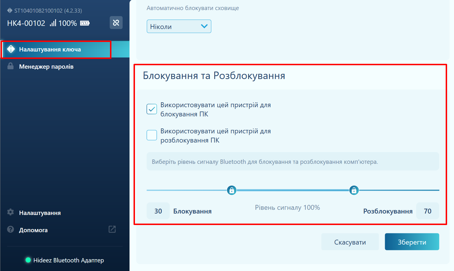 Hideez Key дозволяє Вам налаштовувати блокування та розблокування вашого ПК за механізмом проксіміті. Ваш ПК буде заблоковано, коли рівень сигналу Bluetooth буде меншим за задане у % значення та розблоковано, коли рівень сигналу Bluetooth перевищить задане у % значення.